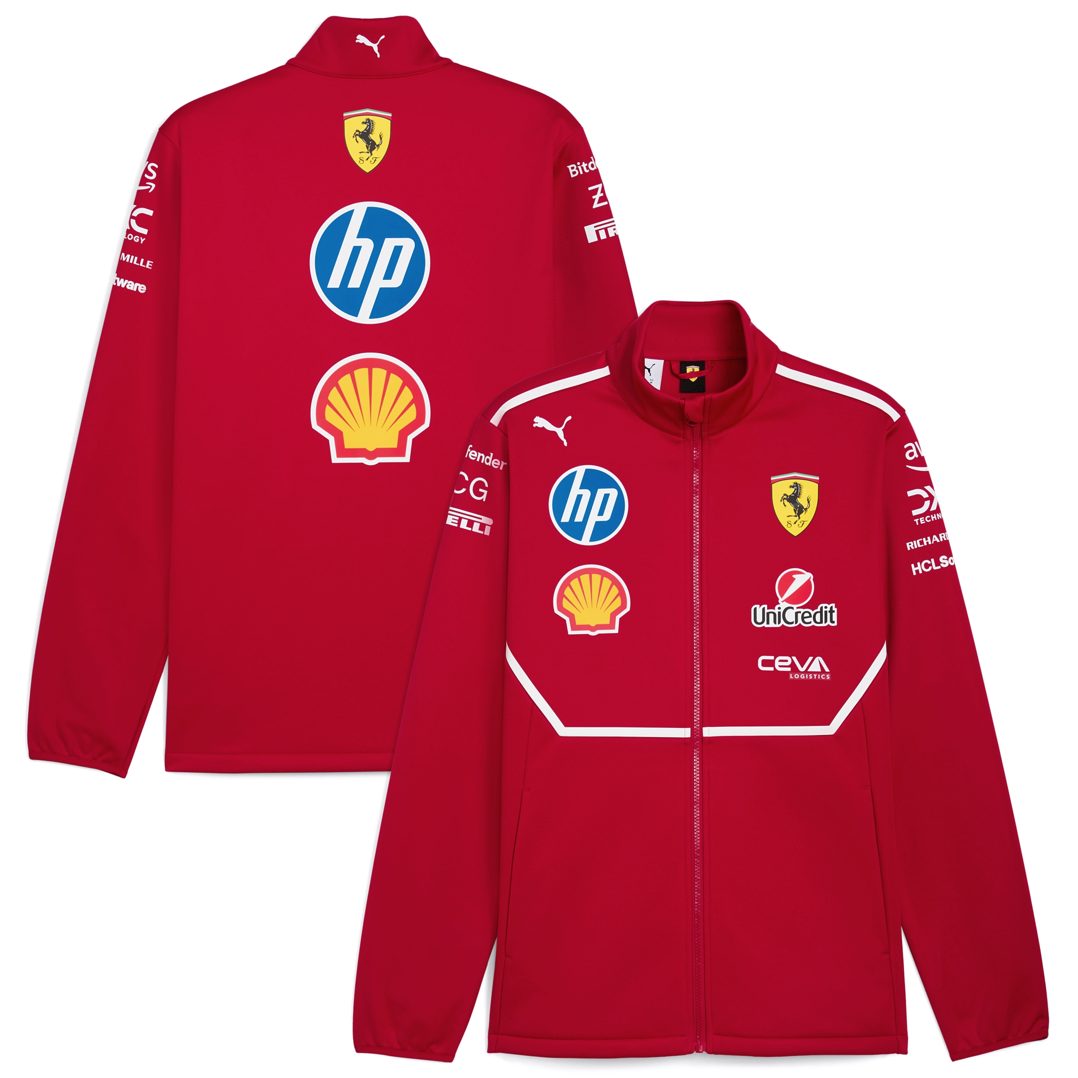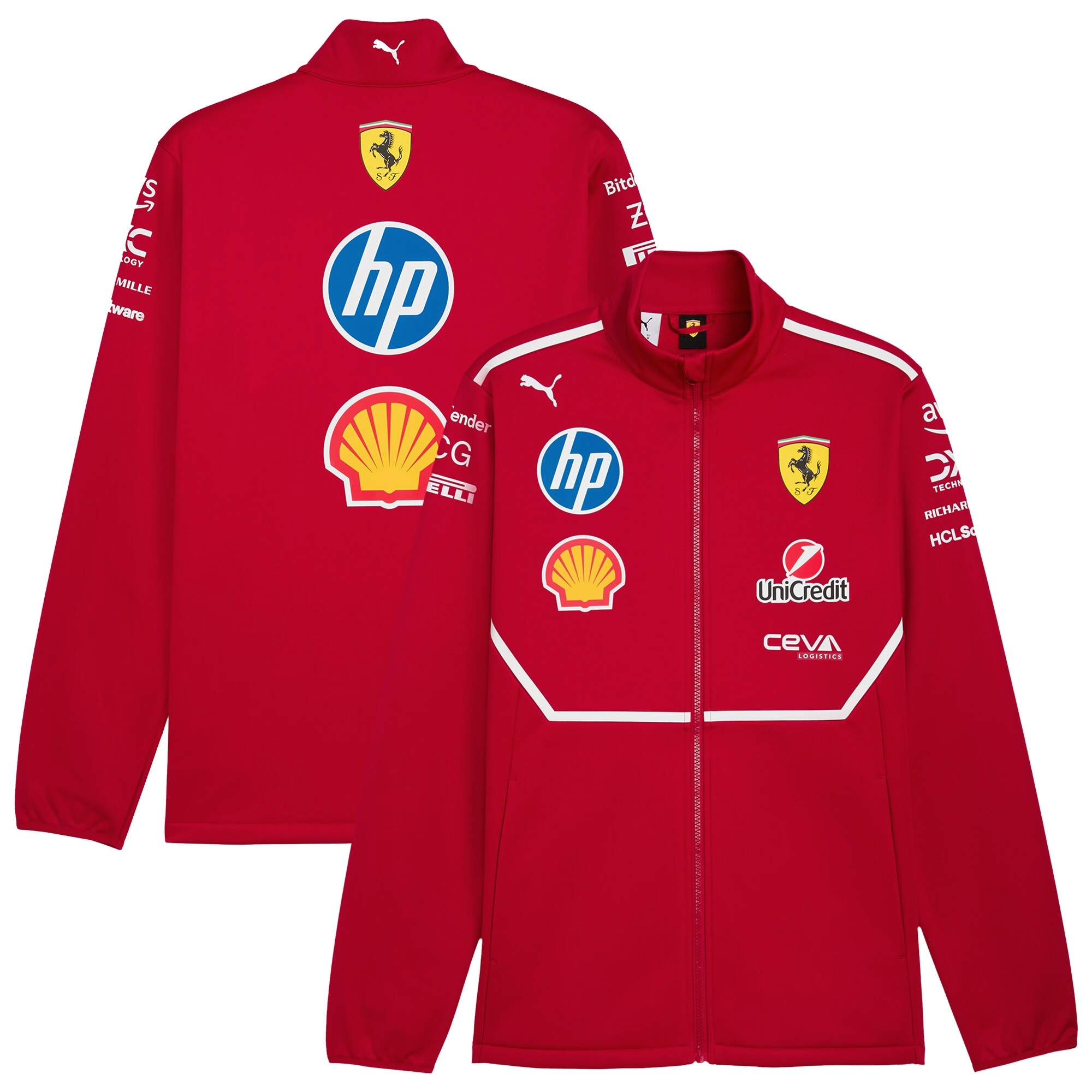 Logo-urile echipei și ale tuturor sponsorilor, pe piept, spate și umeri, printate într-o perfectă calitate Ferrari