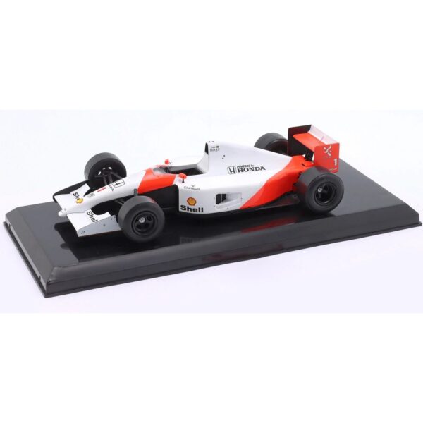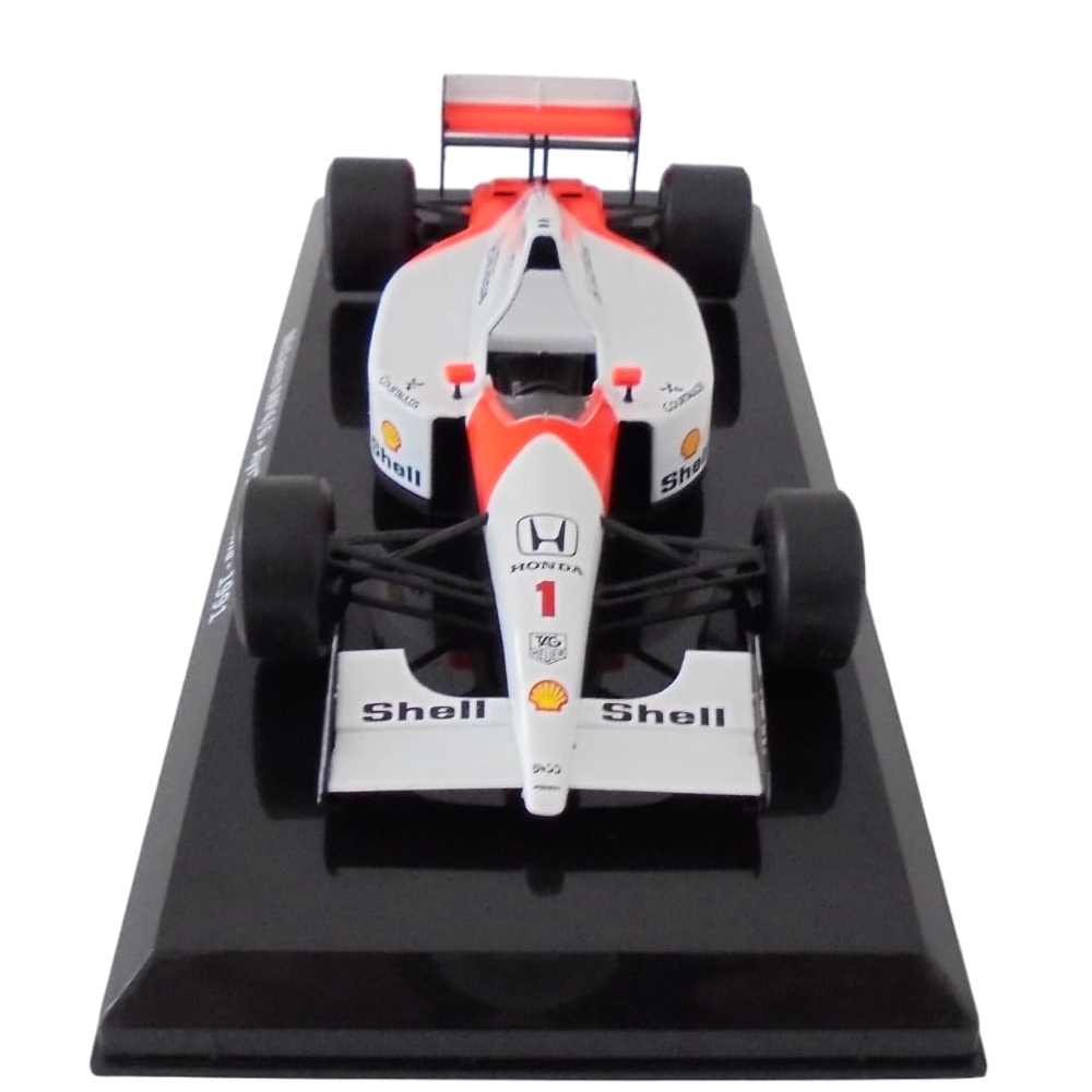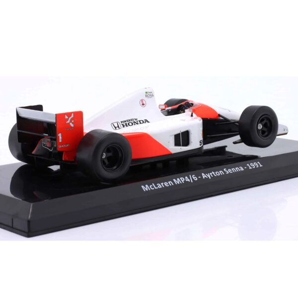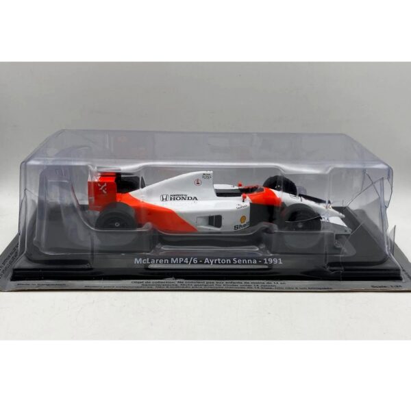 Macheta McLaren MP4/6 pilotata de Ayrton Senna în sezonul 1991, când a obținut titlul de Campion Mondial pentru a treia oară.