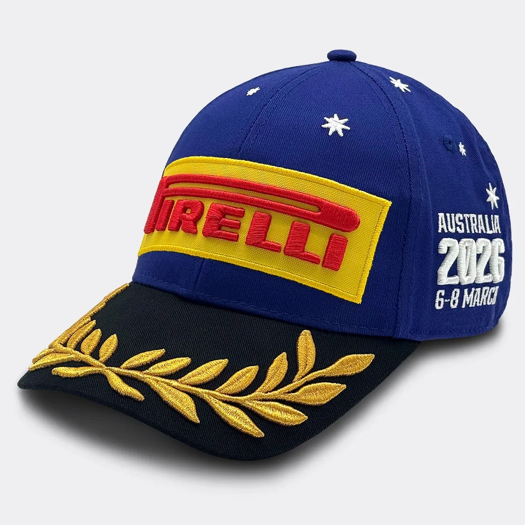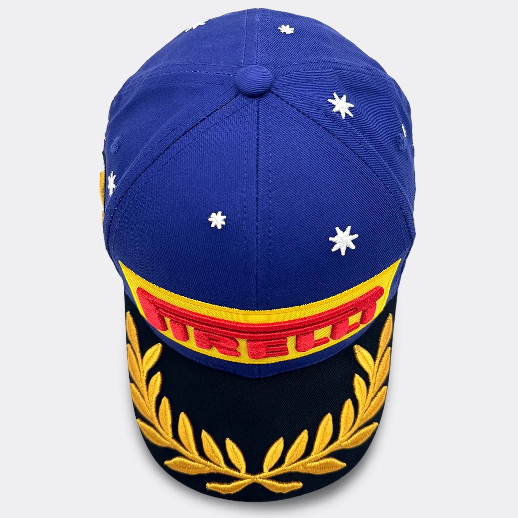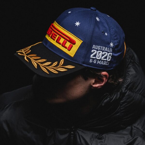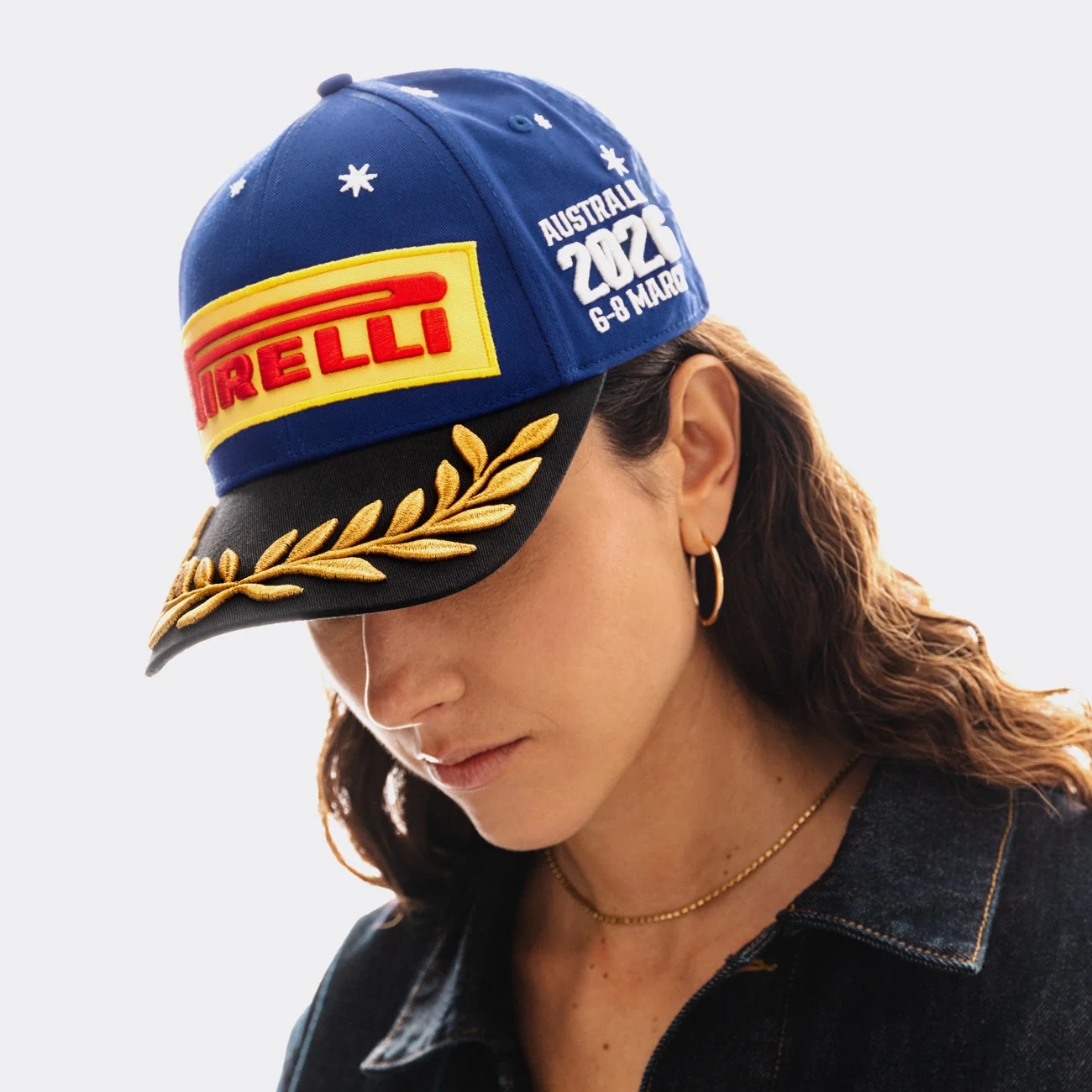 Șapca prezintă logo-ul iconic Pirelli în broderie în relief, detalii specifice cursei Australia 2026 și broderie aurie cu lauri de campion pe cozoroc. Construcția structurată din twill de bumbac oferă durabilitate și formă.