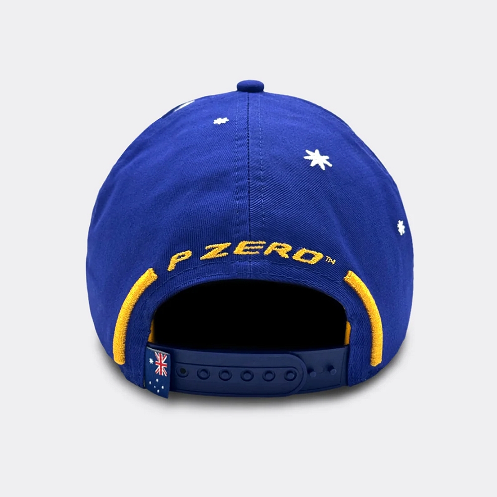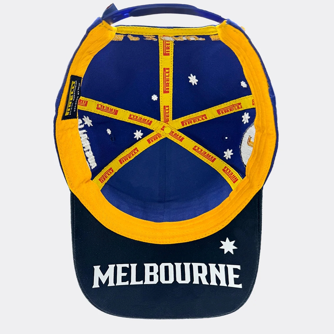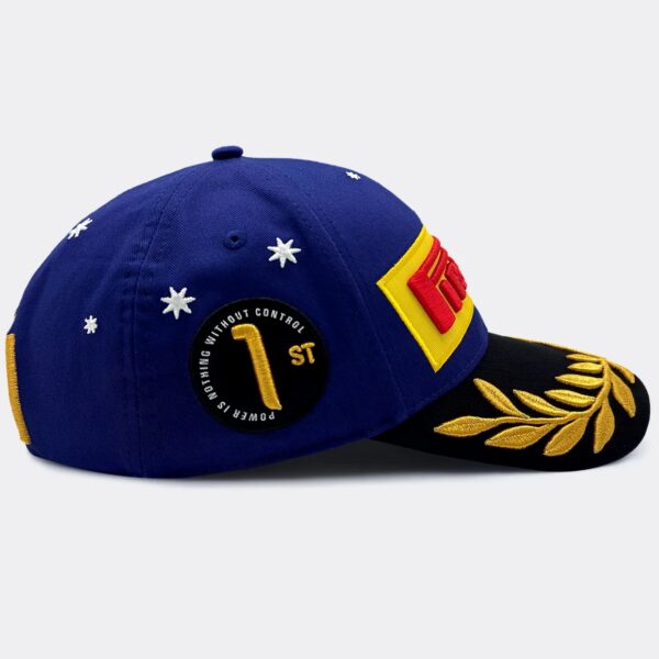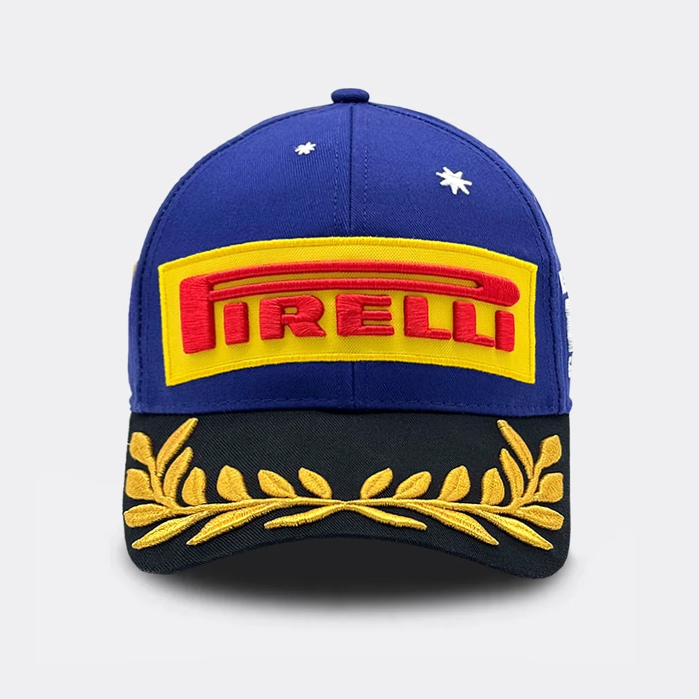 Șapca prezintă logo-ul iconic Pirelli în broderie în relief, detalii specifice cursei Australia 2026 și broderie aurie cu lauri de campion pe cozoroc. Construcția structurată din twill de bumbac oferă durabilitate și formă.